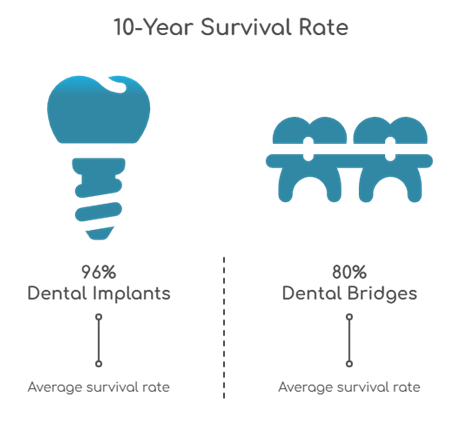 Yes. Research shows implants have a 10-year survival rate of 94–98%, compared to bridges at 72–87%(Jung et al., 2012; Pjetursson et al., 2015). With proper care, implants may last a lifetime, while bridges often need replacement every 10–12 years.